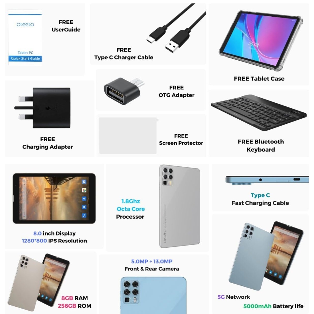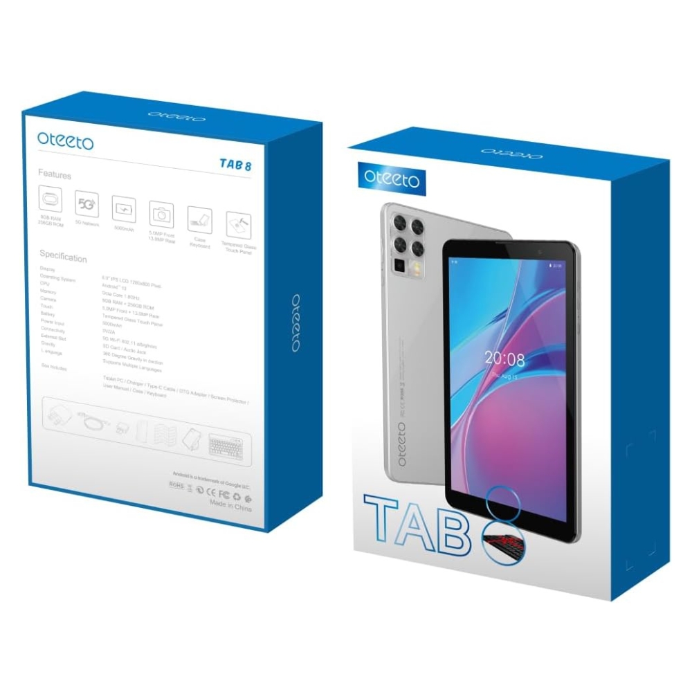 Oteeto Tab 8 Tablet, 8 Inch Display, 8GB RAM, 256GB ROM, Octa Core 1.8GHz, 5G, 5000mAh Battery, 13MP Rear Camera, 5MP Front Camera, Android 13